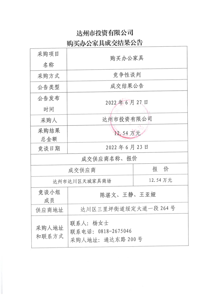 達(dá)州市投資有限公司購(gòu)買辦公家具成交結(jié)果公告